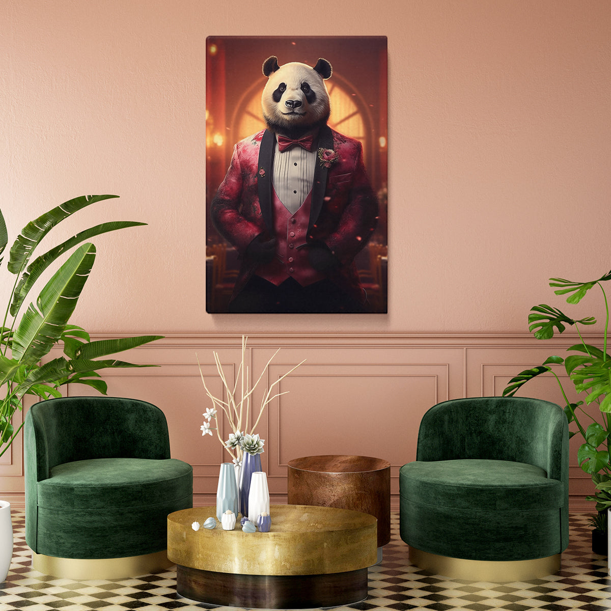 Panda Wall Art > Panda Canvas Print > Panda Canvas Art > Panda Artwork > Panda Art Print > Panda Painting > Panda Wall Decor > Panda Wall Hanging > Panda Prints > Dressed Animal Paintings > Red Tuxedo Panda Painting > Fancy Bear Artwork > Bear with Bow Tie Wall Art > Animal Dressed for Gala Artwork