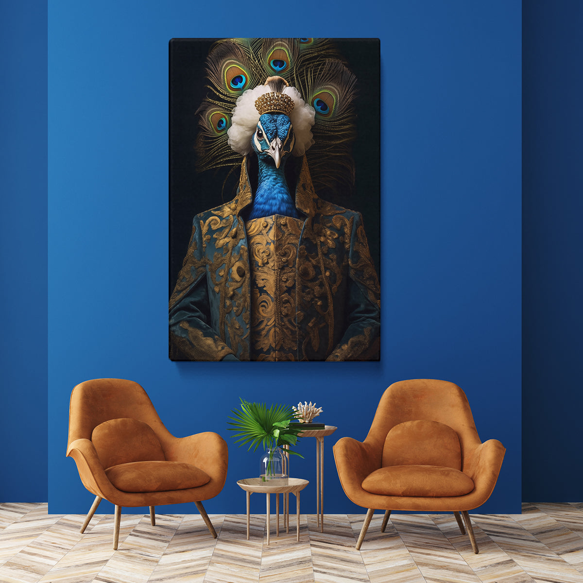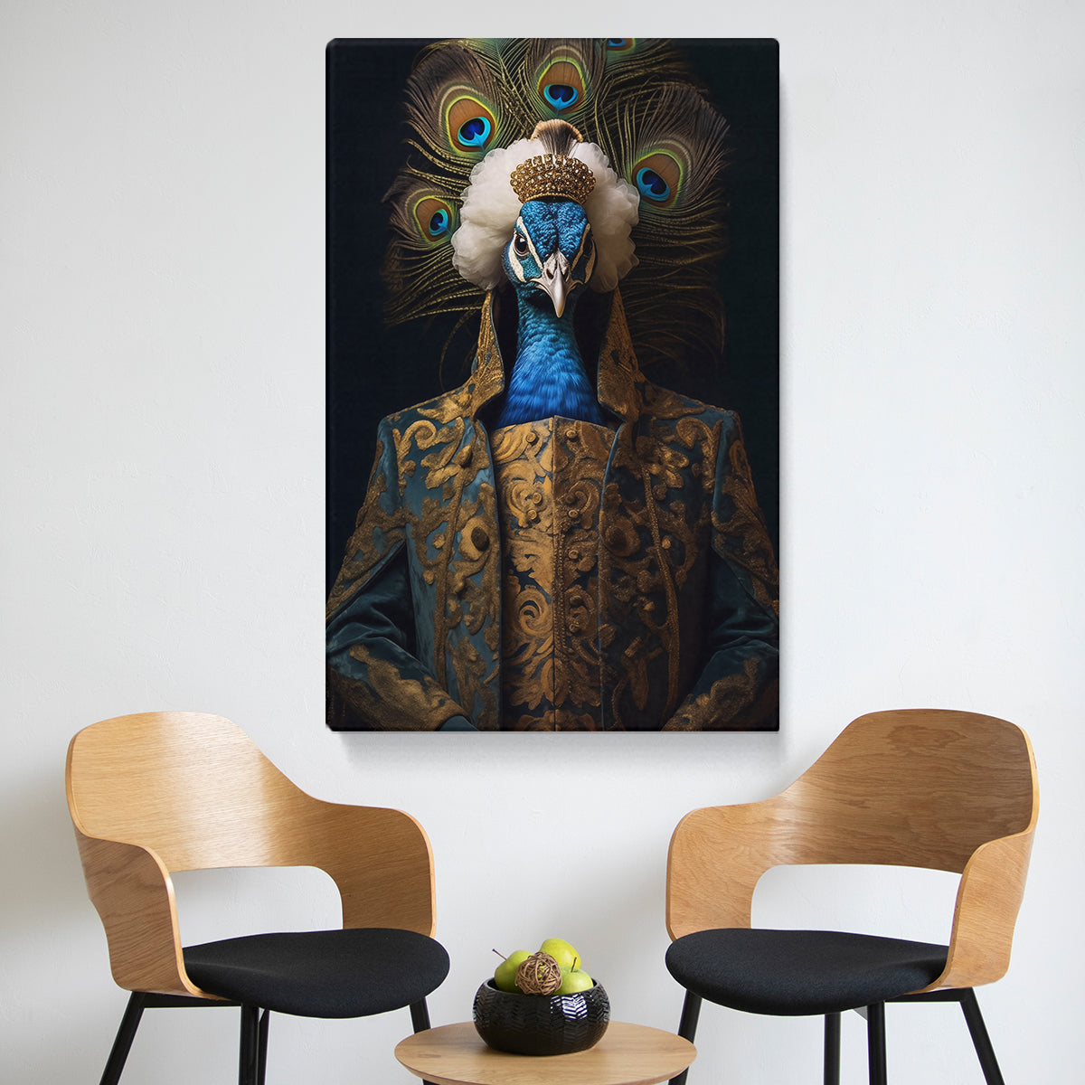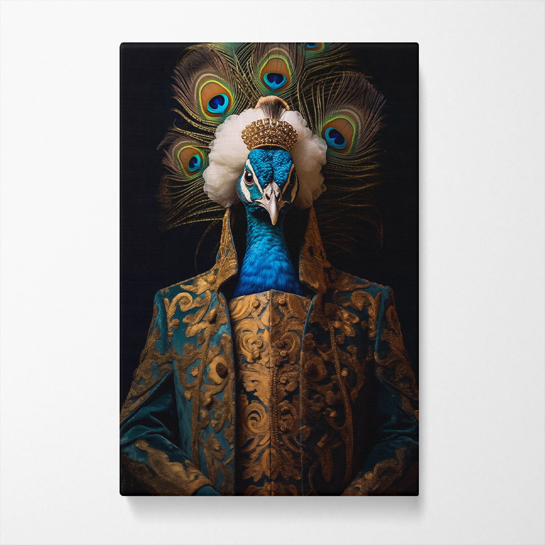 Peacock Wall Art > Peacock Canvas Print > Peacock Canvas Art > Peacock Artwork > Peacock Art Print > Peacock Painting > Peacock Wall Decor > Peacock Wall Hanging > Peacock Prints > Dressed Animal Paintings > Baroque Style Animal Art > Regal Costume Bird Art > Peacock Character Art > Elegant Animal Canvas Print