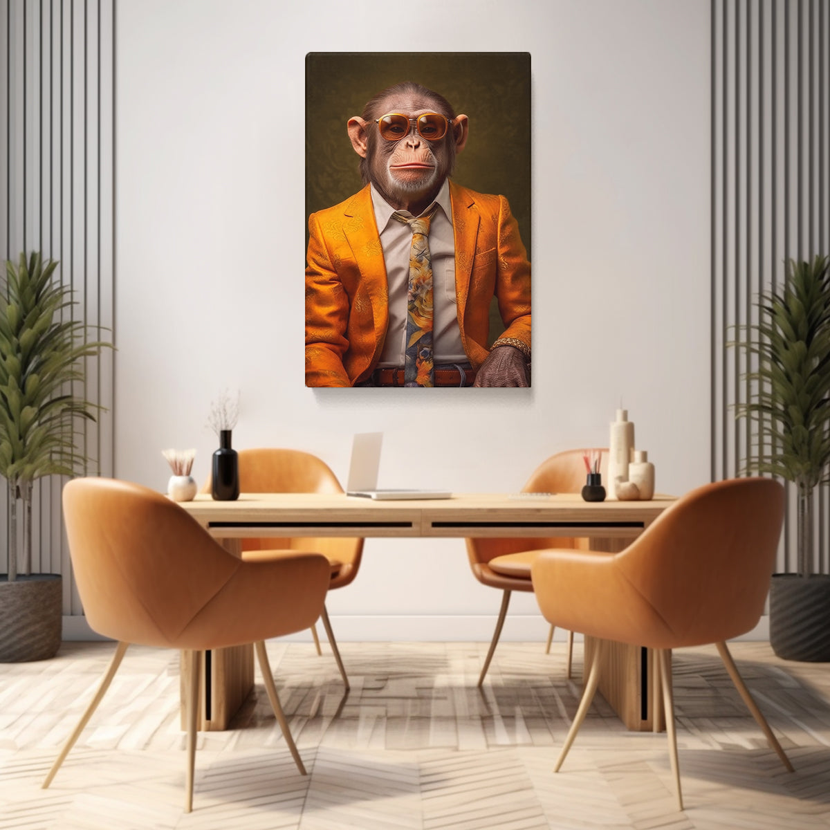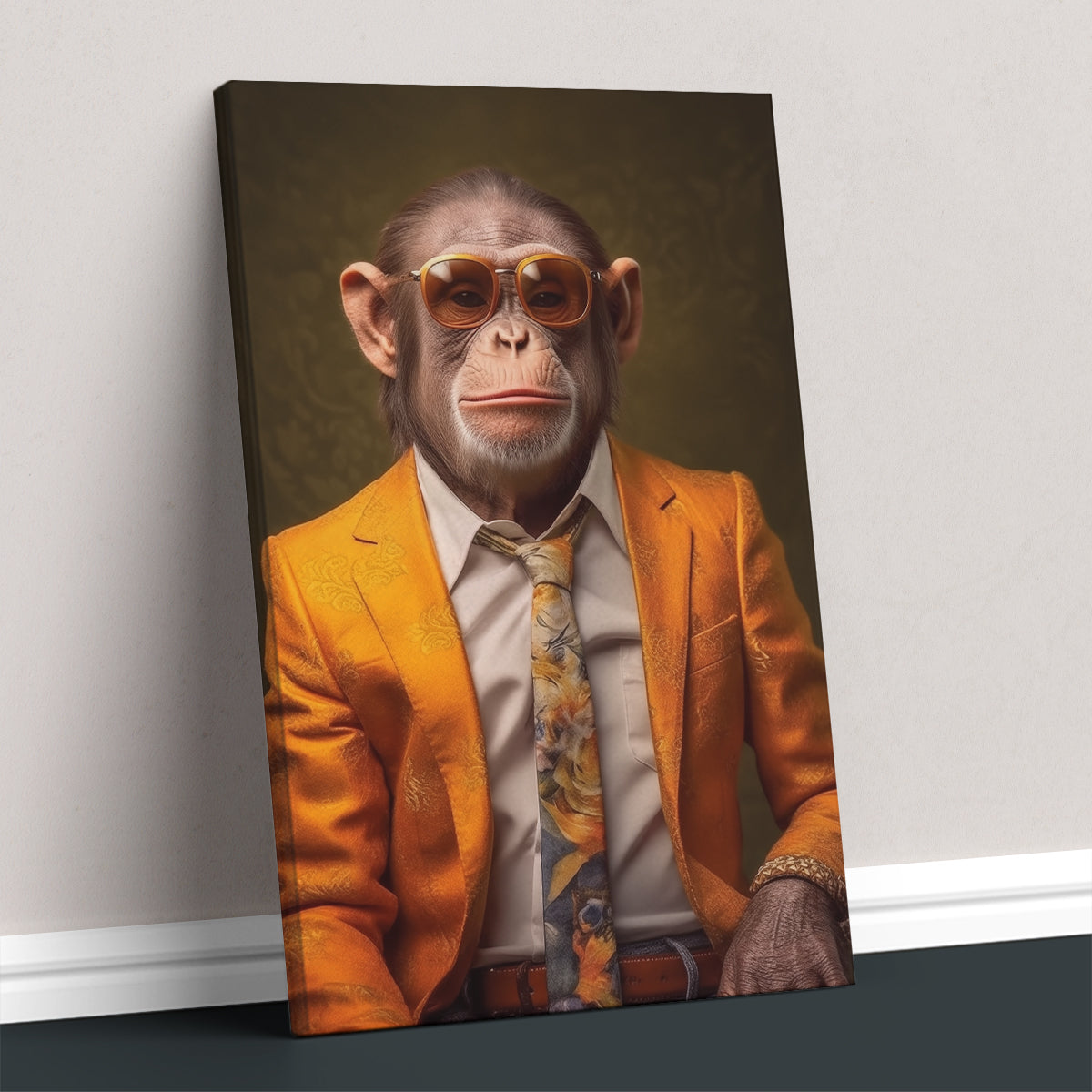 Inject energy, style, and wit into your space with the Cool Monkey in Orange Suit canvas print. This charismatic monkey, dressed in a vivid orange suit with unmistakable confidence, blends fashion-forward flair with wild charm. It's the perfect artwork to spark conversations and bring modern attitude to your wall decor.