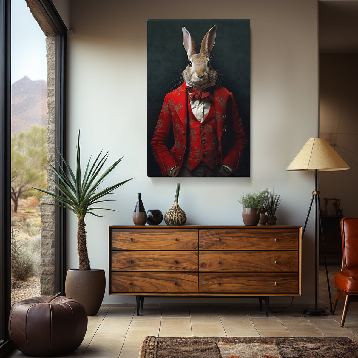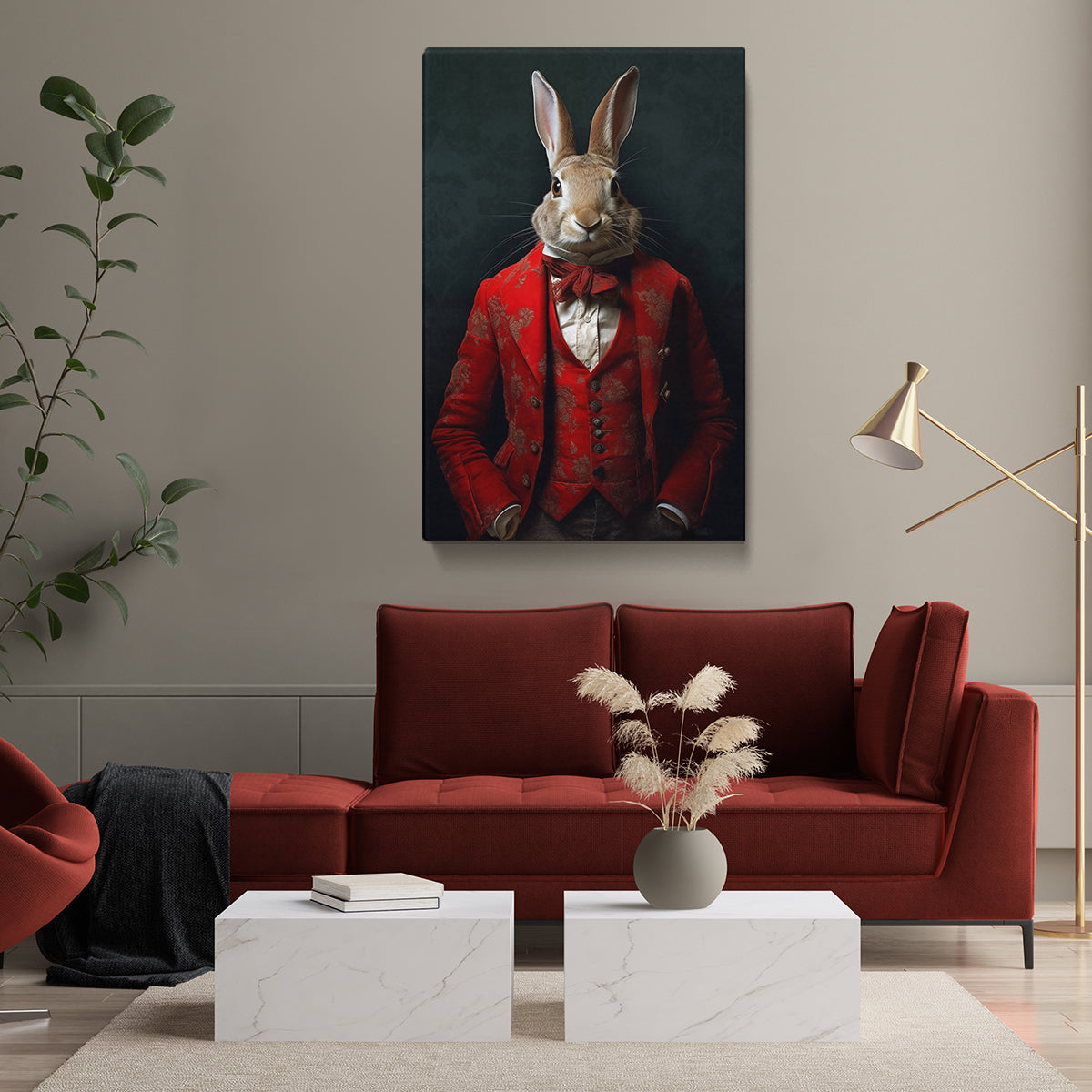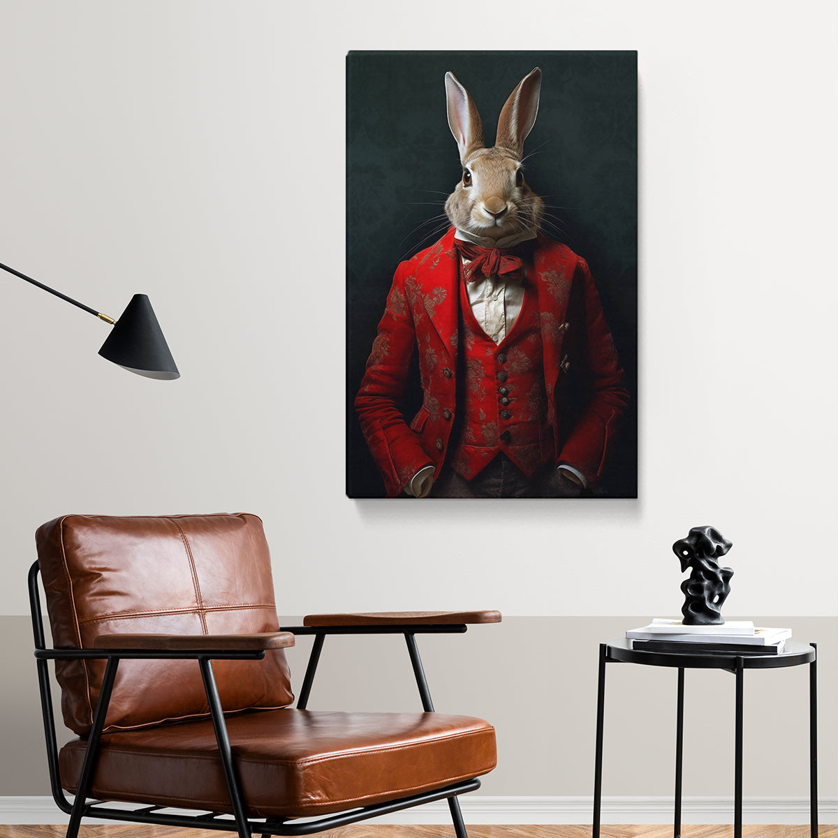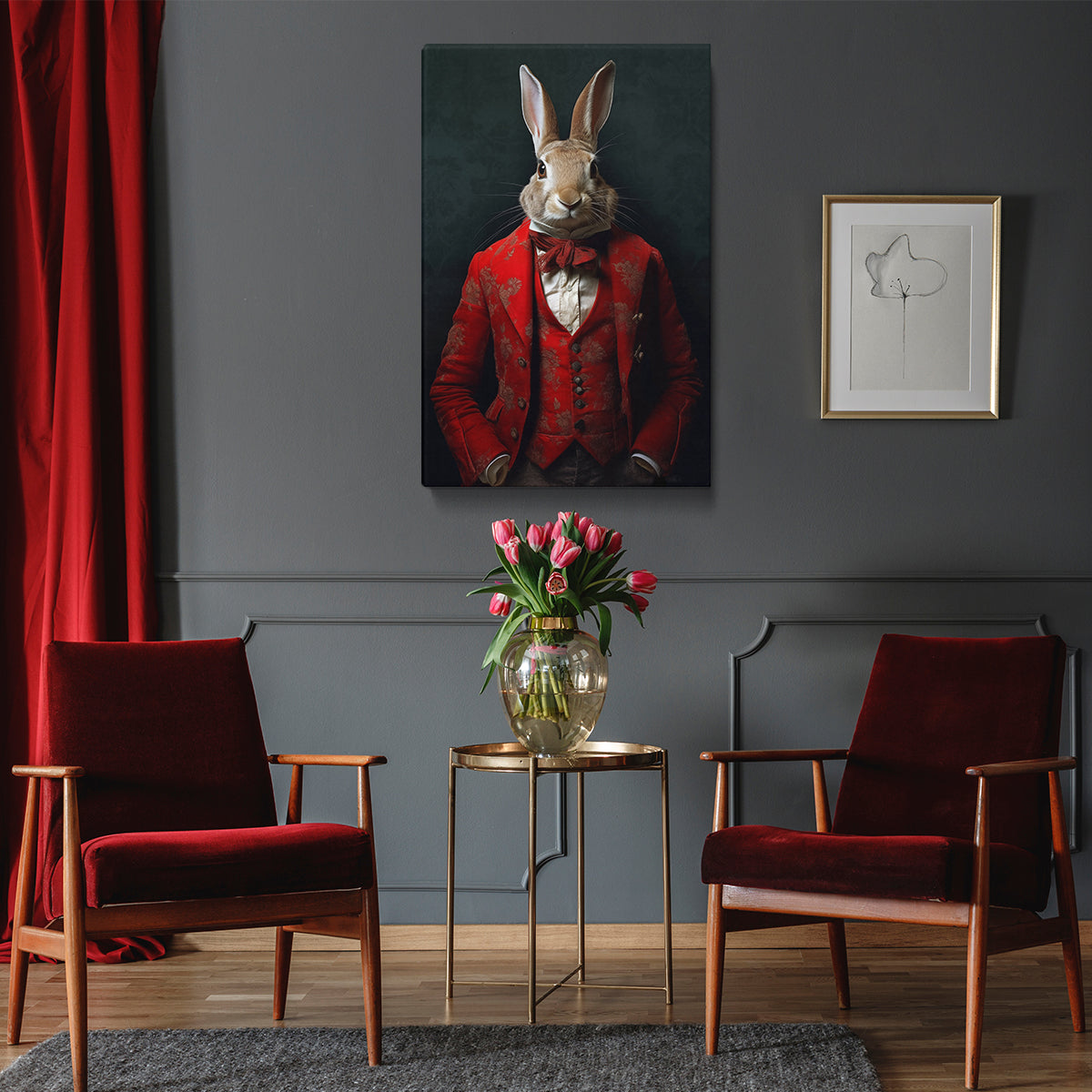 Rabbit Canvas Print in Victorian Red Suit – Regal Charm with a Whimsical Twist