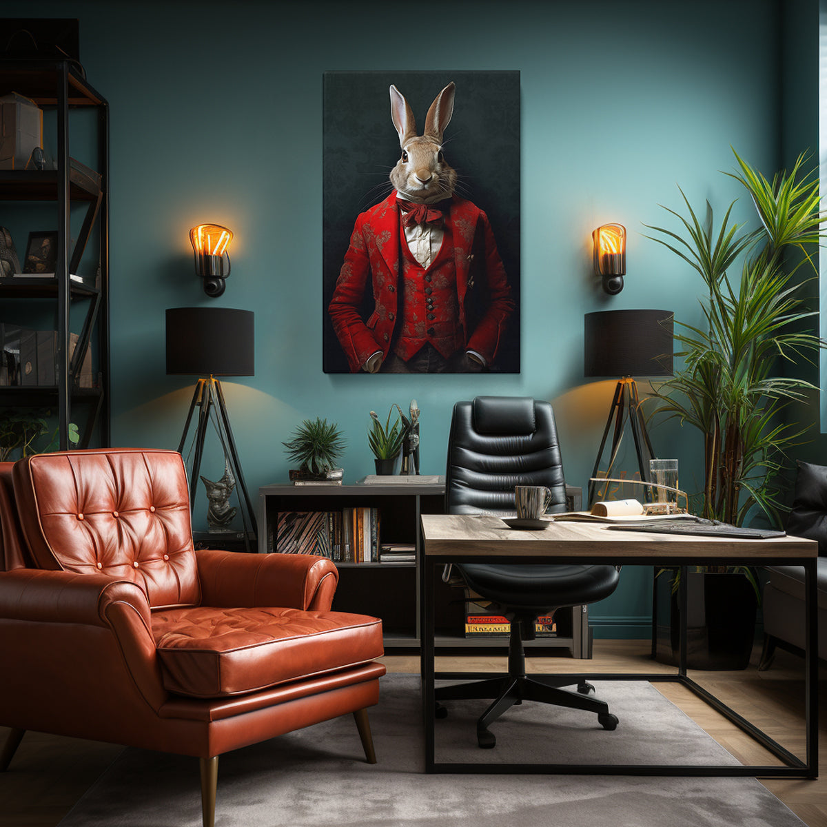 Printed on premium canvas with crisp detail and rich color depth, this piece transforms any space into a conversation starter. Whether you're curating a gallery wall or seeking a standout piece for your study or living room, this noble rabbit delivers timeless charm with a twist of the unexpected.