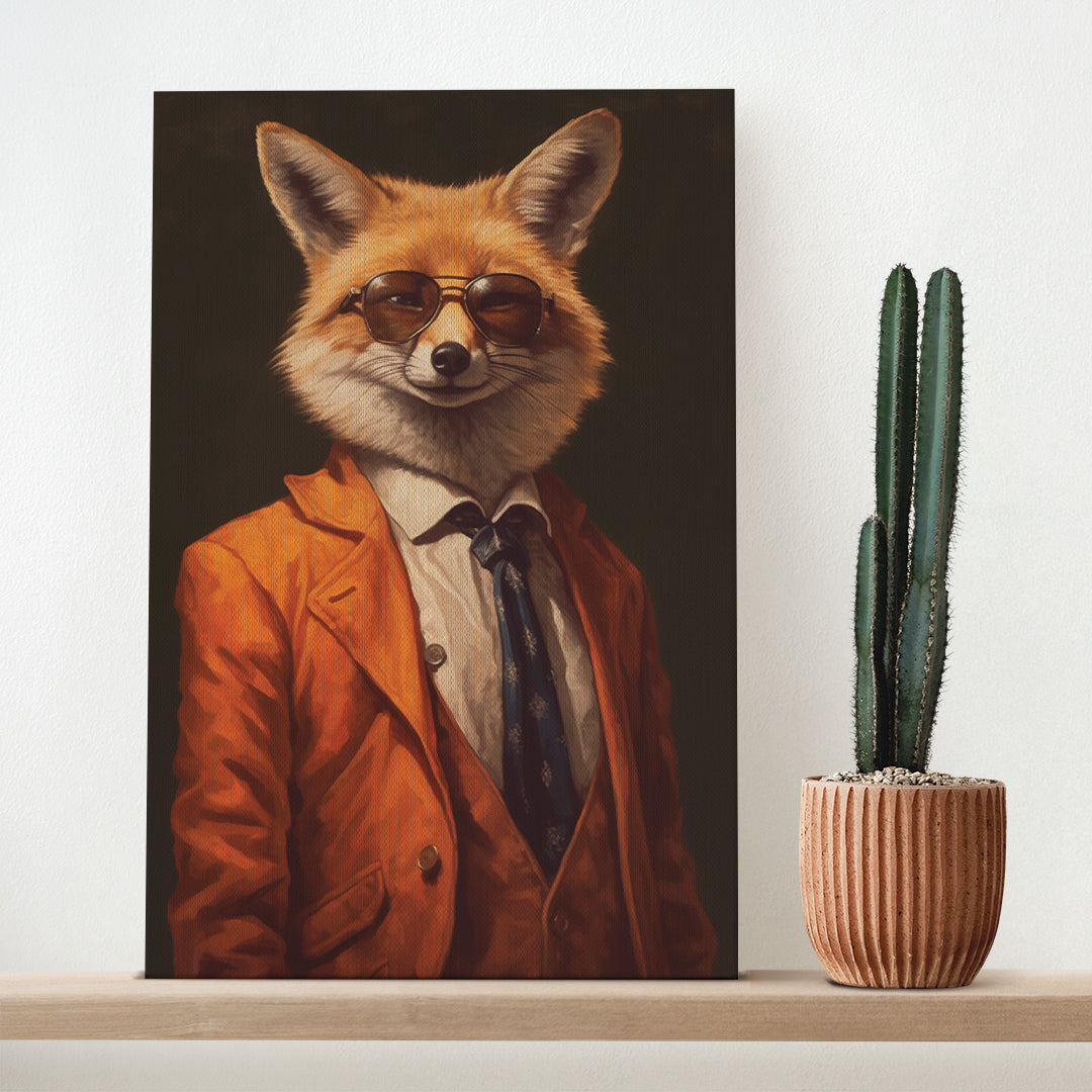 Infuse your space with wit, style, and a touch of daring with the Fox in Orange Suit and Sunglasses canvas print. Featuring the clever fox dressed in a vibrant orange suit and sleek sunglasses, this artwork captures the essence of intelligence, charm, and fashionable confidence.